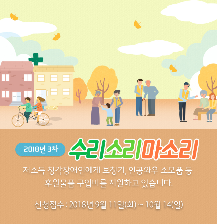 2018년 3차로 온라인 수리소리마소리를 개최하여, 후원물품 구입비를 지원받을 저소득 청각장애인을 추천 받고 있으니, 사회복지기관의 많은 관심과 참여바랍니다.