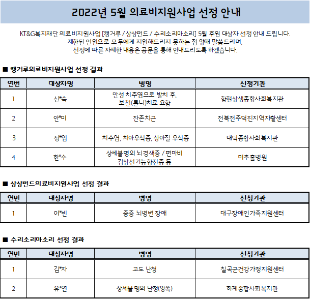 2022년 5월 의료비지원사업(캥거루/상상펀드/수리소리마소리) 선정발표(4월 신청기관)