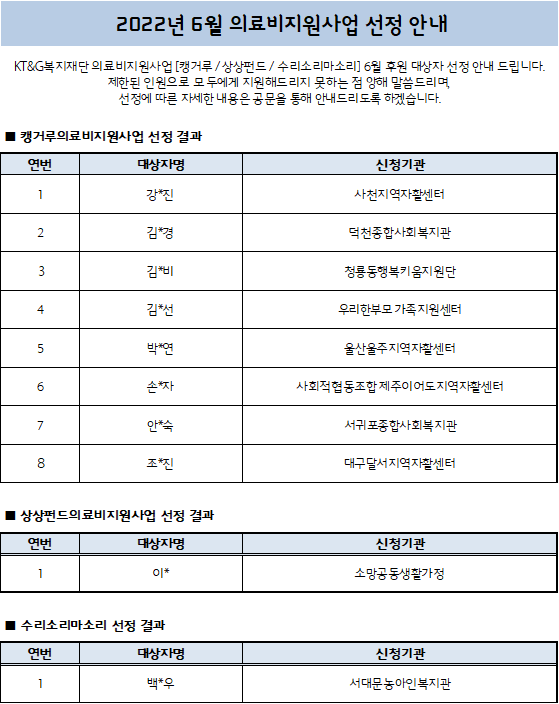 2022년 6월 의료비지원사업(캥거루/상상펀드/수리소리마소리) 선정발표(5월 신청기관)