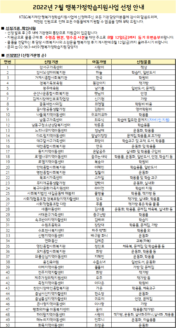 2022년 7월 행복가정학습지원사업(6월 신청기관) 선정발표