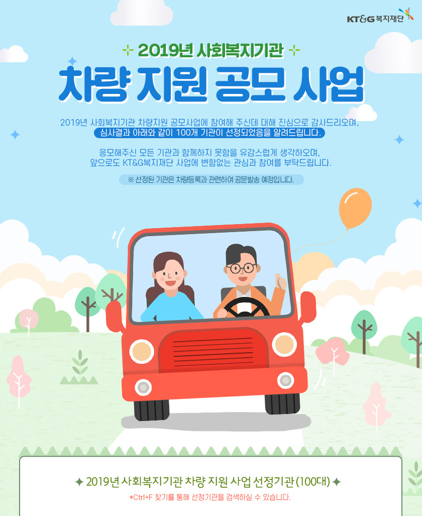 | 746 | 2019년 사회복지기관 차량지원 공모사업 선정기관 발표 | 2019-09-06 | 5479 |